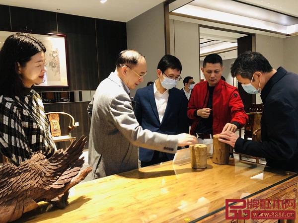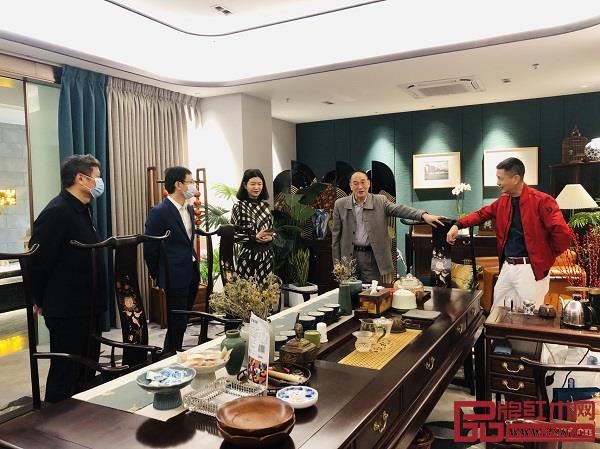 中國(guó)家具協(xié)會(huì)副理事長(zhǎng)、紅古軒品牌創(chuàng)始人吳赤宇(左)為中山市政協(xié)副主席劉志偉(右)介紹紅古軒生產(chǎn)經(jīng)營(yíng)情況