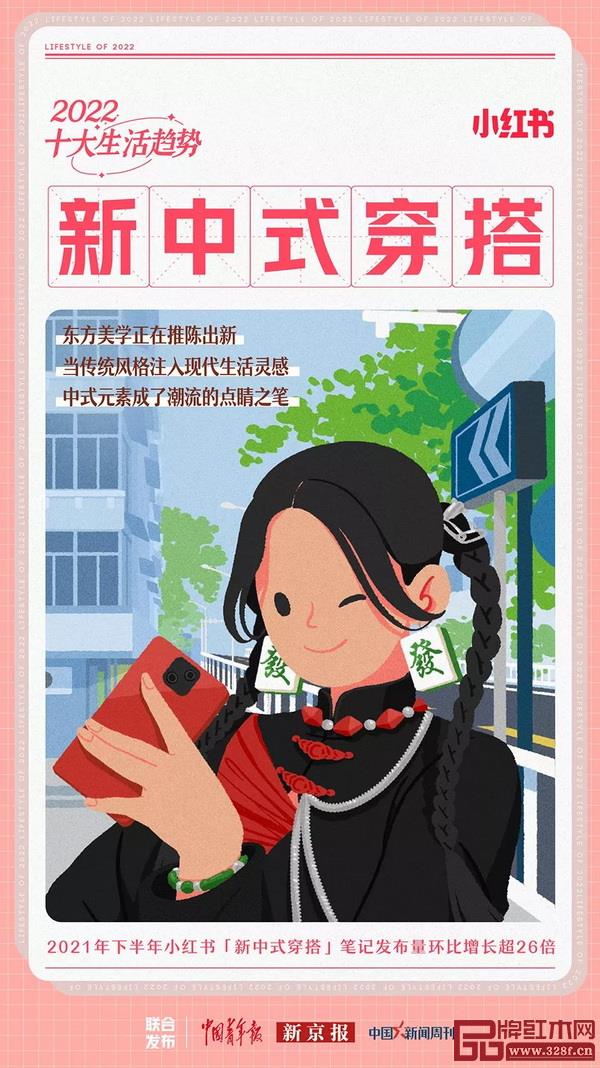 特別是在抖音、B站、小紅書等社交媒體的帶動下,“國潮”現(xiàn)在成為受新中產(chǎn)青睞的新興生活方式。就像前段時間,小紅書發(fā)布的《2022十大生活趨勢》,其中預(yù)測國潮國風穿搭將成為2022年十大生活趨勢之一。