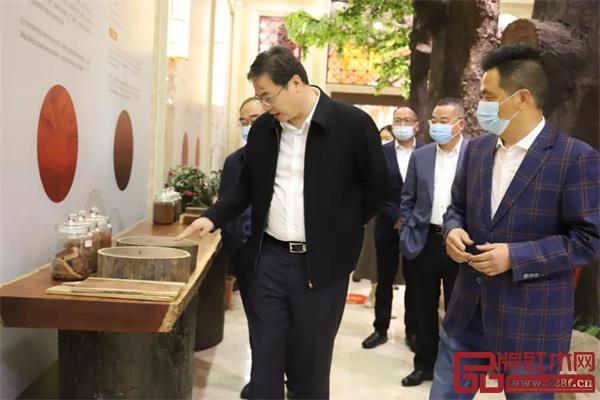 中信紅木董事長(zhǎng)陪同市委書記樓瑯堅(jiān)參觀展廳。