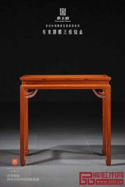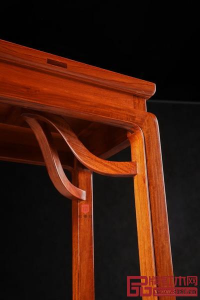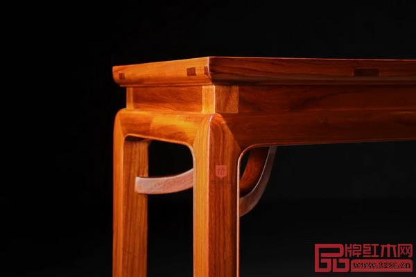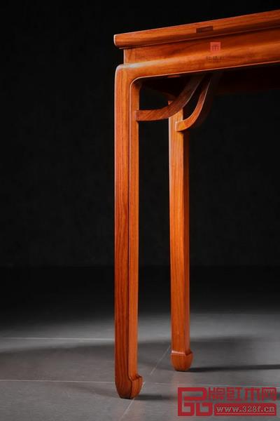 福建省紅橋紅家居有限公司(以下簡稱緬花大王紅橋紅)經(jīng)典復(fù)刻此條桌,桌面格角攢邊打槽平鑲面心,下裝穿帶出梢支承,大邊半透榫,做法尚古。