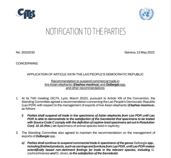 5月12日,瀕危野生動植物種國際貿(mào)易公約(CITES)組織在瑞士日內(nèi)瓦發(fā)布本年度第30號締約方通知,維持老撾黃檀屬和馬達(dá)加斯加黃檀屬和柿屬物種貿(mào)易禁令。