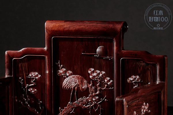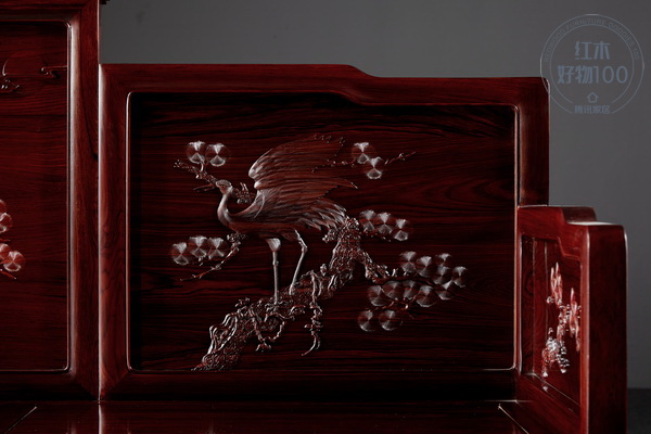 松是“百木之長(zhǎng)”,鶴是“百羽之宗”,松與鶴象征長(zhǎng)壽和高潔,兩種意象也被道家引入神仙世界。萬(wàn)年長(zhǎng)青、神思高雅的“仙物”和紅木家具的堅(jiān)固耐用遙相呼應(yīng),整套家具看著給人寧?kù)o逍遙的感覺。