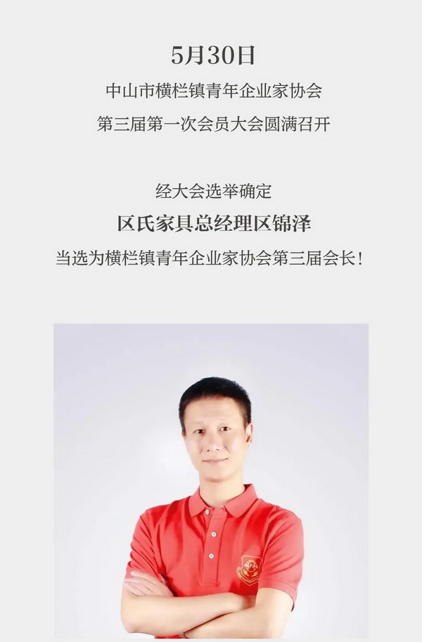 [摘要]區(qū)氏家具總經(jīng)理區(qū)錦澤當(dāng)選為橫欄鎮(zhèn)青年企業(yè)家協(xié)會第三屆會長。