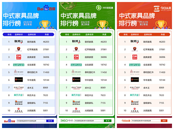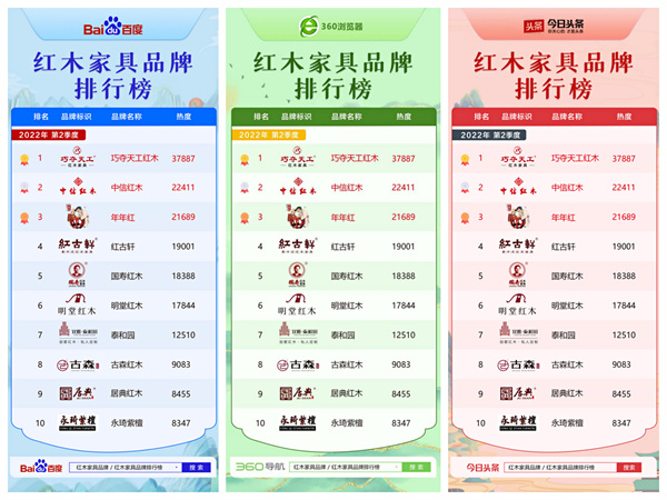 第一份榜單是百度、360、今日頭條紅木家具品牌排行榜及中式家具品牌排行榜,是以平臺的搜索引擎的熱度為數(shù)據(jù),通過云計算統(tǒng)計分析得出的。這份榜單以品牌綜合實力、歷年榮譽、業(yè)界排名等為依托,綜合了多家權(quán)威媒體、專業(yè)評估機構(gòu)的最新數(shù)據(jù),具有較高的影響力、公信力和關(guān)注度,值得消費者購買紅木家具時參考與信賴。