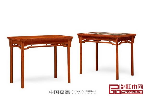 兩桌以緬甸花梨木為材,木紋清晰美觀,自然流暢。桌面攢框平鑲面心,邊抹可見明榫。無束腰,光素刀牙板,沿邊起稍微寬一點(diǎn)的皮條線,并打洼作,工藝細(xì)致考究。四足圓材,直接落地。腿間施一木整挖的羅鍋棖,加矮老。
