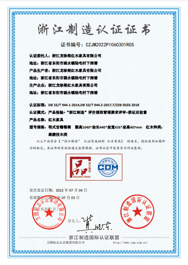 2022年7月4日,浙江龍珍閣紅木家具有限公司(以下簡稱龍珍閣)在浙江省眾多優(yōu)秀企業(yè)的競爭中脫穎而出,榮獲“浙江制造”認證證書,被授權使用“品”字標志,正式躋身于“品”字標浙江制造高端品牌的大家庭,足以見證龍珍閣不凡的品質及實力。