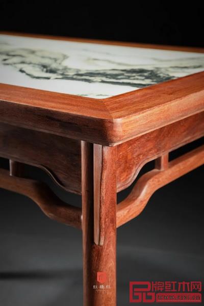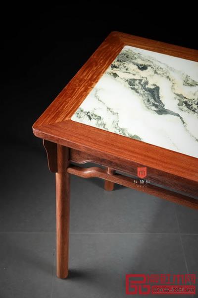 緬花大王紅橋紅《恭王府一腿三牙云石面/木面書桌》在中國嘉德2022春拍展覽現(xiàn)場