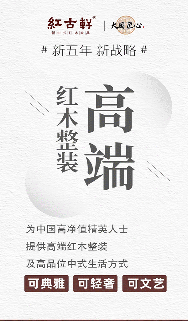 在這樣的新態(tài)勢(shì)下,中山市紅古軒家具有限公司(以下簡(jiǎn)稱紅古軒)對(duì)品牌25年發(fā)展歷程進(jìn)行深刻總結(jié),煥新品牌戰(zhàn)略規(guī)劃,全新提出三個(gè)“高端”定位,致力于為客戶創(chuàng)造高品位、高附加值的一站式服務(wù),成為高品位中式家居生活的提供者。