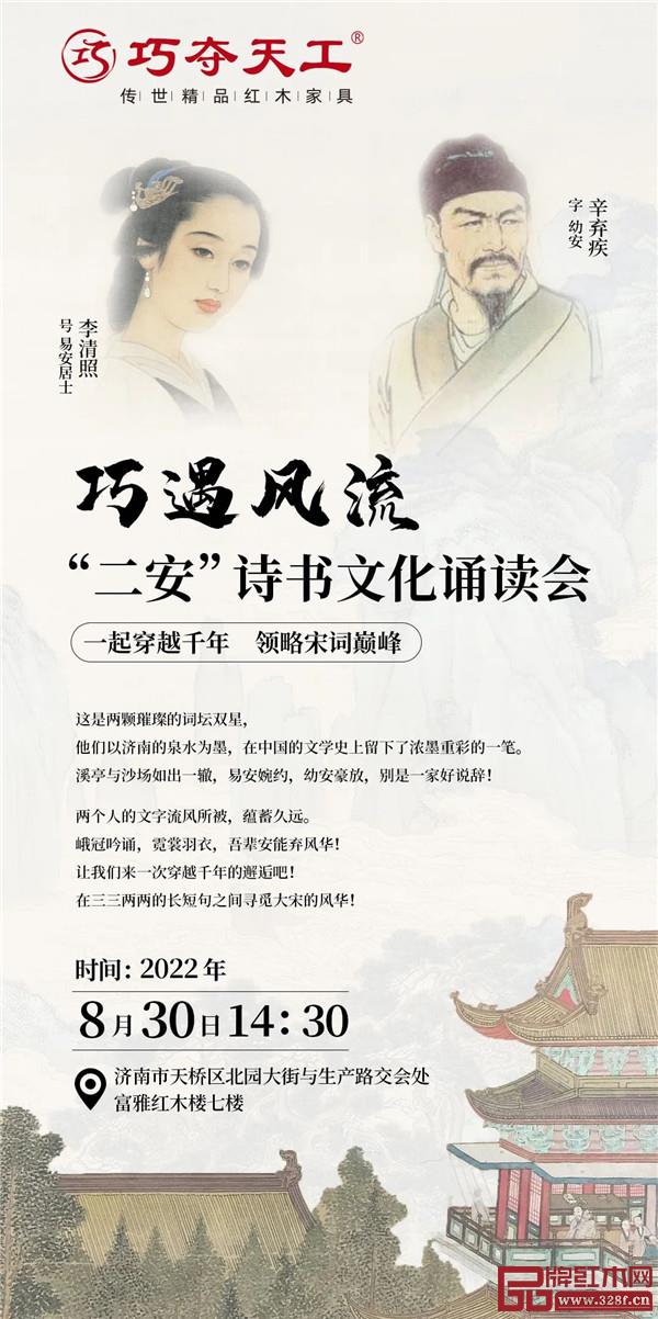 8月30日,巧奪天工紅木將舉辦巧遇風(fēng)流“二安”詩書文化誦讀會,與大家領(lǐng)略“濟(jì)南二安”李清照和辛棄疾的優(yōu)秀作品,以詞會友,傳承國學(xué)精粹。