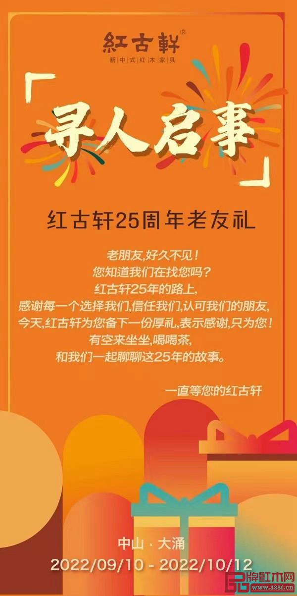 為了回饋廣大客戶對(duì)紅古軒多年來的支持,紅古軒發(fā)出“尋人啟事”,尋找25年來每一位選擇、信任、認(rèn)可紅古軒的老朋友,邀請他們重回紅古軒,并送上“紅古軒25周年老友禮”,分享喜悅、開懷暢敘。