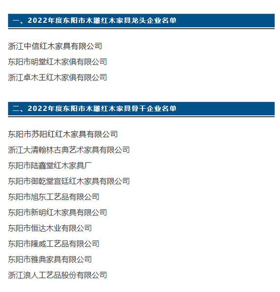 近日,東陽市人民政府公布了《關(guān)于命名2022年度東陽市木雕紅木家具龍頭企業(yè)、骨干企業(yè)的通知》,命名浙江中信紅木家具有限公司等3家企業(yè)為2022年度市木雕紅木家具龍頭企業(yè),東陽市蘇陽紅紅木家具有限公司等10家企業(yè)為2022年度市木雕紅木家具骨干企業(yè)。