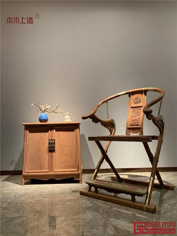 圓形椅圈大體上可由三至五段形成,均為大料挖做,再結合榫卯結構,使其嚴實密縫。其接榫處、踏床面板處加以金屬飾件,而金屬葉片與家具結合相得益彰,渾然一體,相輔相成,即為裝飾也可加固。