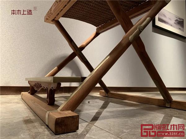 交椅四條腿兩兩交叉,與貼地橫材立面形成四個支點以及多個穩(wěn)定三角形;以腿足的力量支撐扶手,讓人坐在上面,穩(wěn)如泰山。