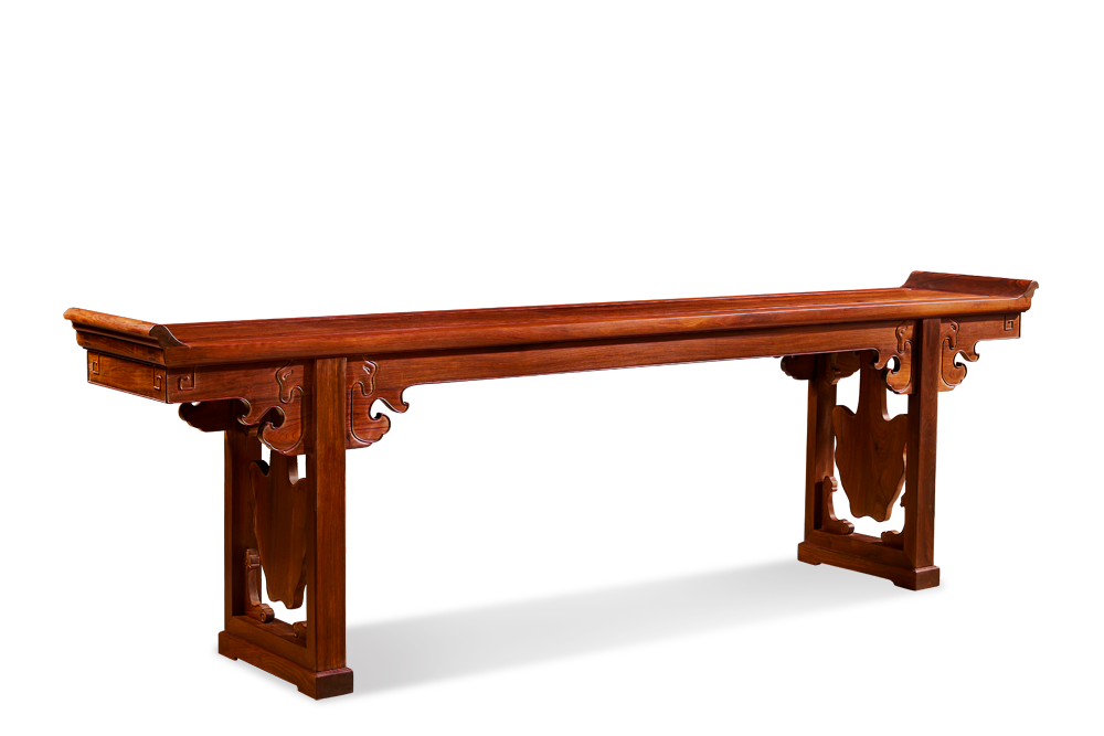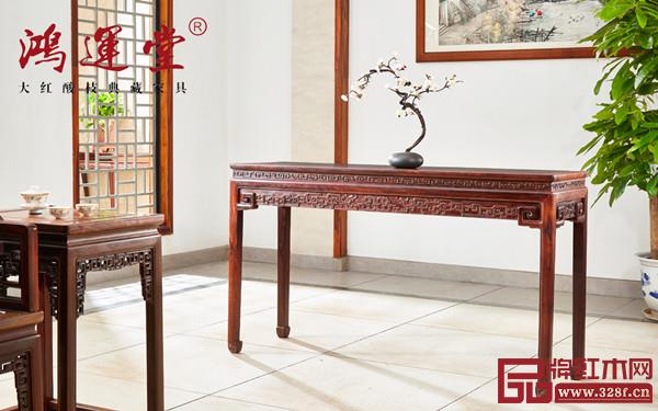 在方框中經(jīng)常做窗格透欞狀,或透雕靈芝紋等裝飾性圖案,托泥下開小壺門,一般腿微向外撇,方框腿將兩條方腿之間的空間充分利用起來,增加了案子的體量感和穩(wěn)定感,兩側(cè)檔板又起到裝飾美化的作用。