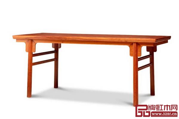 畫案以緬甸花梨木制,案面格角攢邊框鑲嵌板心,邊抹光素,冰盤沿線腳。夾頭榫結(jié)構(gòu),瓜棱腿,光素刀牙板,側(cè)面設(shè)雙梯棖。