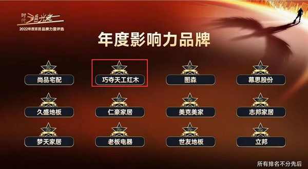 從榜單中發(fā)現(xiàn),巧奪天工紅木憑借在精益智造和文化交流方面做出的杰出貢獻(xiàn),獲得“2022家居品牌力量榜—年度影響力品牌”,是榜單中紅木行業(yè)唯一獲此大獎(jiǎng)的紅木品牌。這是巧奪天工紅木繼2021年之后再次蟬聯(lián)年度影響力品牌。