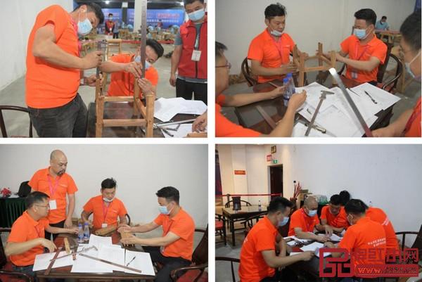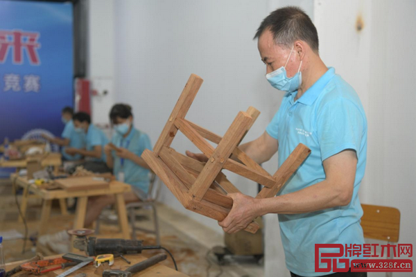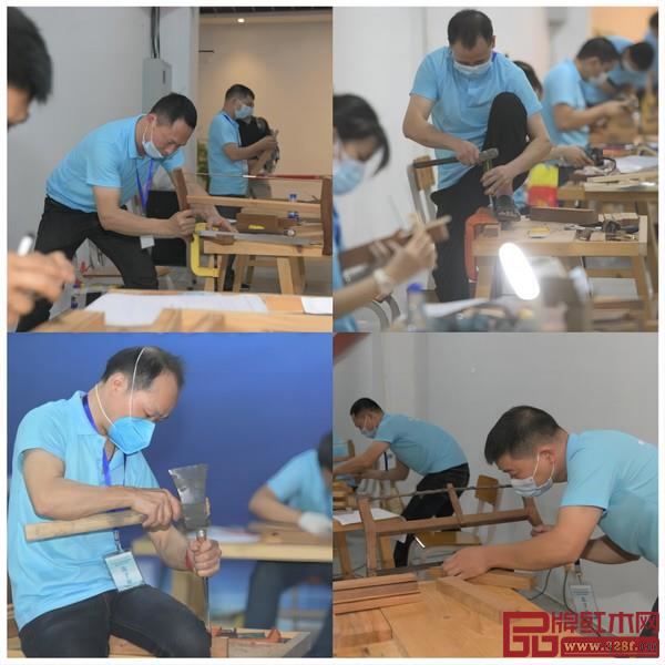 現(xiàn)場,各參賽選手在賽場精彩炫技、各顯神通,專業(yè)規(guī)范的操作手法、追求完美的品質(zhì)標(biāo)準(zhǔn)、力求速度的超越等都是此次競賽的關(guān)鍵點(diǎn)。本次競賽共有八個(gè)小時(shí)的制作時(shí)間,設(shè)立了三個(gè)考核模塊,其中包含面板裝配、腳架制作、整體組裝,參考世界技能大賽的評(píng)分標(biāo)準(zhǔn)進(jìn)行考核,極大的體現(xiàn)出了紅木家具制作工藝的精湛!