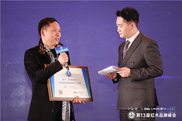 萬事紅紅木榮獲“2022微凹黃檀家具熱門品牌”,董事長蔣國洪上臺領(lǐng)獎