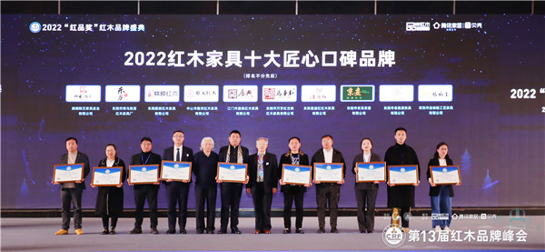 萬事紅紅木榮獲“2022紅木家具十大匠心口碑品牌”,蔣國洪(右五)代表企業(yè)上臺領(lǐng)獎