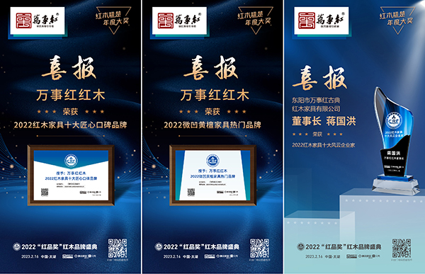 2月16日,第13屆中國紅木家具品牌峰會在蘇州太湖國際會議中心圓滿舉行。CRF“紅品獎”紅木品牌盛典同期舉行,對2022年度紅木家具行業(yè)的杰出個人和優(yōu)秀品牌進行表彰頒獎。萬事紅紅木實力蟬聯(lián),榮獲2022年度“紅木家具十大匠心口碑品牌”、“微凹黃檀家具熱門品牌”,萬事紅紅木董事長蔣國洪榮獲2022年度“紅木家具十大風(fēng)云企業(yè)家”。