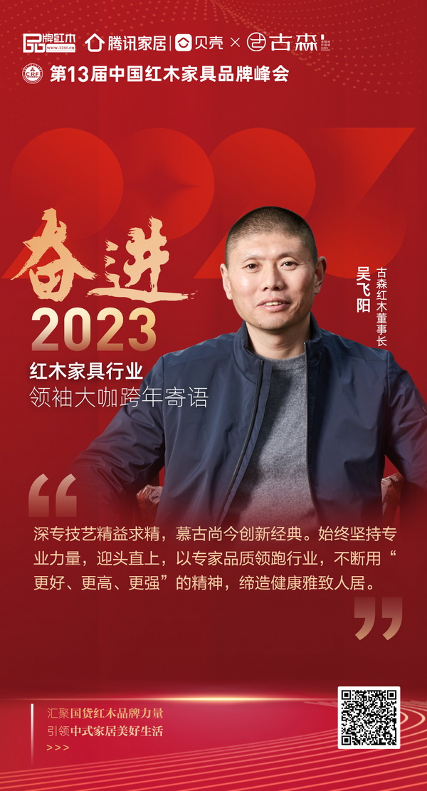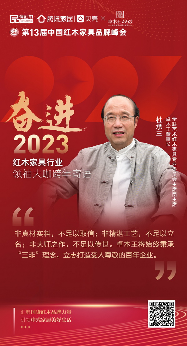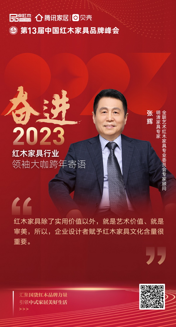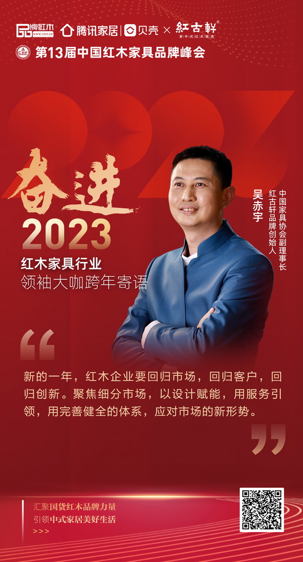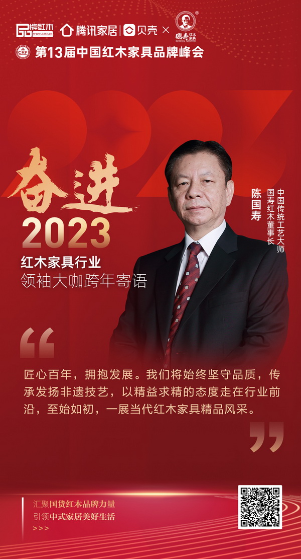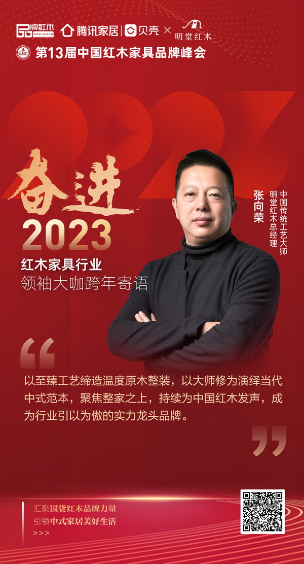 在跨年之際,品牌紅木、騰訊家居|貝殼特別策劃,第13屆中國(guó)紅木家具品牌峰會(huì)攜手各大業(yè)內(nèi)專家及品牌大咖向廣大業(yè)界人士,發(fā)起“奮進(jìn)2023 紅木家具行業(yè)領(lǐng)袖大咖(品牌精英)跨年寄語(yǔ)”,為全行業(yè)匯聚國(guó)貨紅木品牌力量,引領(lǐng)中式家居美好生活!