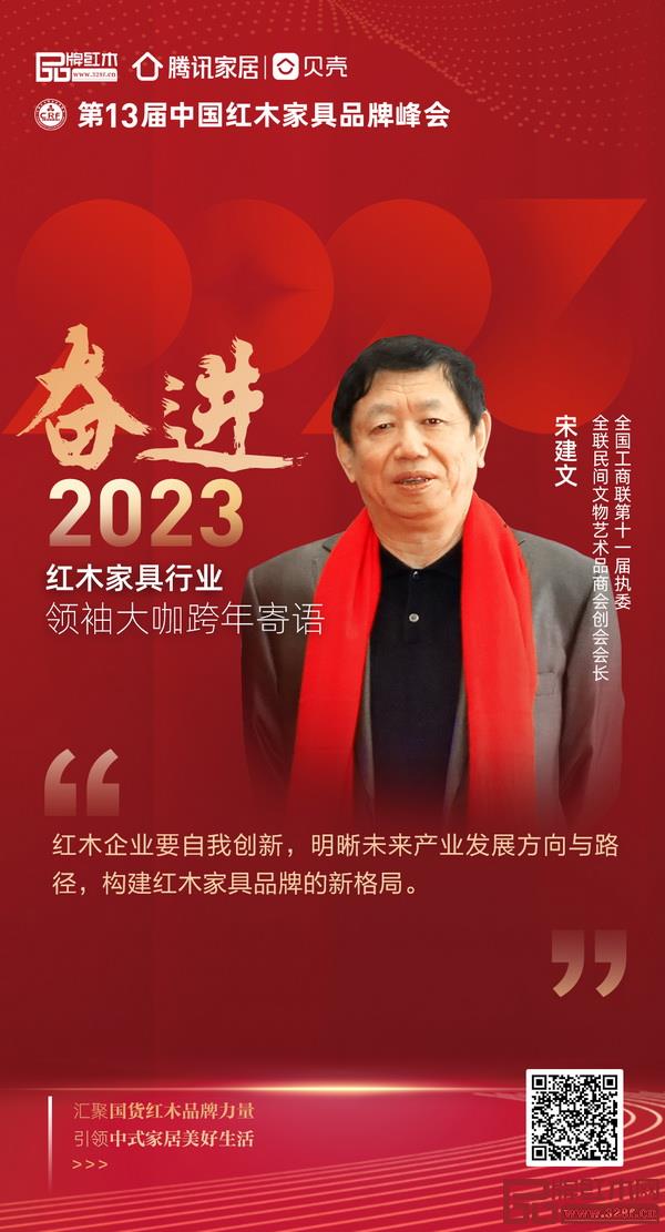 全國(guó)工商聯(lián)第十一屆執(zhí)委、全聯(lián)民間文物藝術(shù)品商會(huì)創(chuàng)會(huì)會(huì)長(zhǎng)宋建文為紅木家具行業(yè)奮進(jìn)2023年送來(lái)寄語(yǔ):紅木企業(yè)要自我創(chuàng)新,明晰未來(lái)產(chǎn)業(yè)發(fā)展方向與路徑,構(gòu)建紅木家具品牌的新格局。