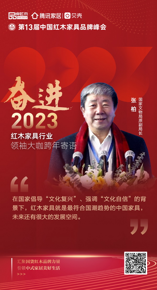 國家文物局原副局長張柏為紅木家具行業(yè)奮進(jìn)2023年送來寄語:在國家倡導(dǎo)“文化復(fù)興”、強(qiáng)調(diào)“文化自信”的背景下,紅木家具就是最符合國潮趨勢(shì)的中國家具,未來還有很大的發(fā)展空間。