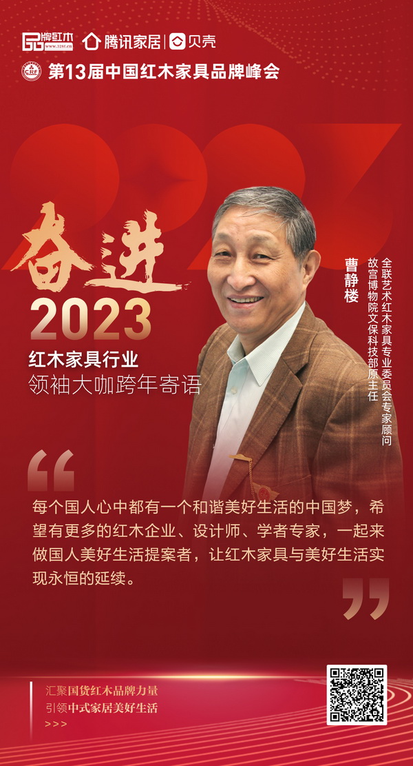 [摘要]全聯(lián)藝術(shù)紅木家具專業(yè)委員會(huì)專家顧問、故宮博物院文??萍疾吭魅尾莒o樓為紅木家具行業(yè)奮進(jìn)2023年送來寄語:每個(gè)國人心中都有一個(gè)和諧美好生活的中國夢,希望有更多的紅木企業(yè)、設(shè)計(jì)師、學(xué)者專家,一起來做國人美好生活提案者,讓紅木家具與美好生活實(shí)現(xiàn)永恒的延續(xù)。