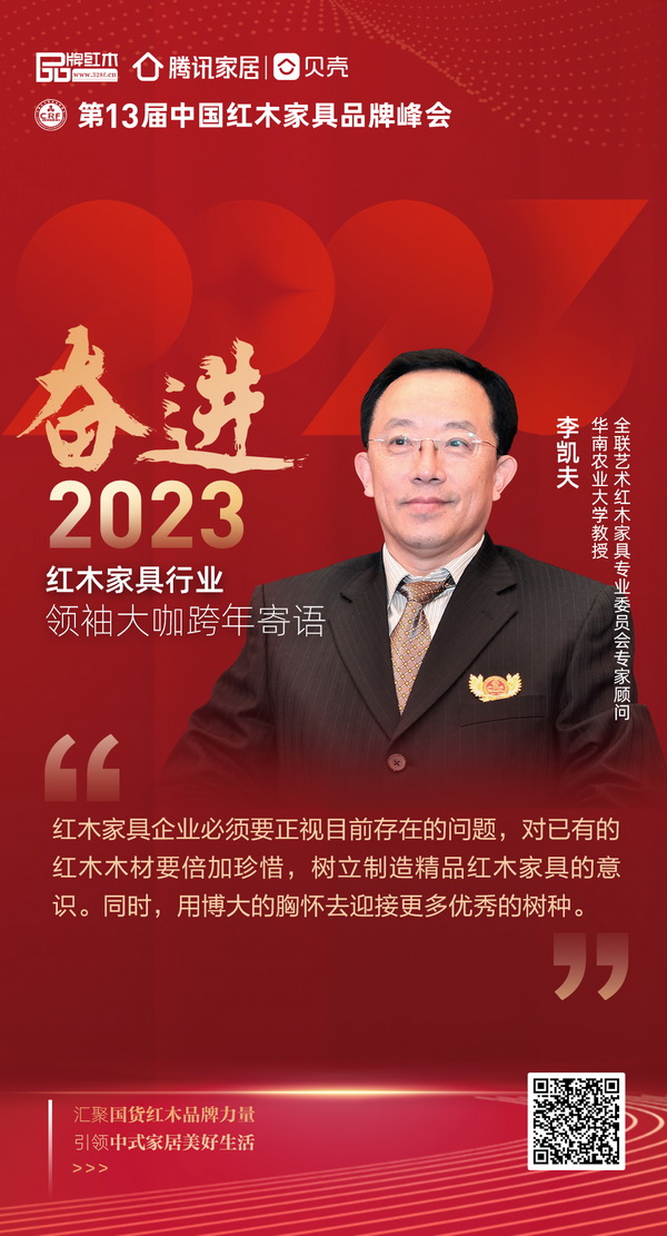 全聯(lián)藝術(shù)紅木家具專業(yè)委員會(huì)專家顧問、華南農(nóng)業(yè)大學(xué)教授李凱夫?yàn)榧t木家具行業(yè)奮進(jìn)2023年送來寄語:紅木家具企業(yè)必須要正視目前存在的問題,對(duì)已有的紅木木材要倍加珍惜,樹立制造精品紅木家具的意識(shí)。同時(shí),用博大的胸懷去迎接更多優(yōu)秀的樹種。