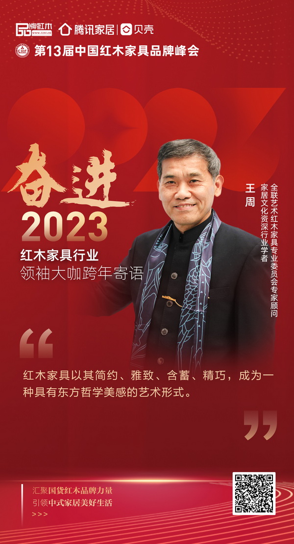 全聯(lián)藝術(shù)紅木家具專業(yè)委員會專家顧問、家居文化資深行業(yè)學(xué)者王周為紅木家具行業(yè)奮進2023年送來寄語:紅木家具以其簡約、雅致、含蓄、精巧,成為一種具有東方哲學(xué)美感的藝術(shù)形式。