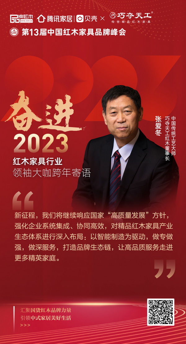 在跨年之際,品牌紅木、騰訊家居|貝殼特別策劃,第13屆中國紅木家具品牌峰會攜手各大業(yè)內(nèi)專家及品牌大咖向廣大業(yè)界人士,發(fā)起“奮進2023 紅木家具行業(yè)領(lǐng)袖大咖(品牌精英)跨年寄語”,為全行業(yè)匯聚國貨紅木品牌力量,引領(lǐng)中式家居美好生活!