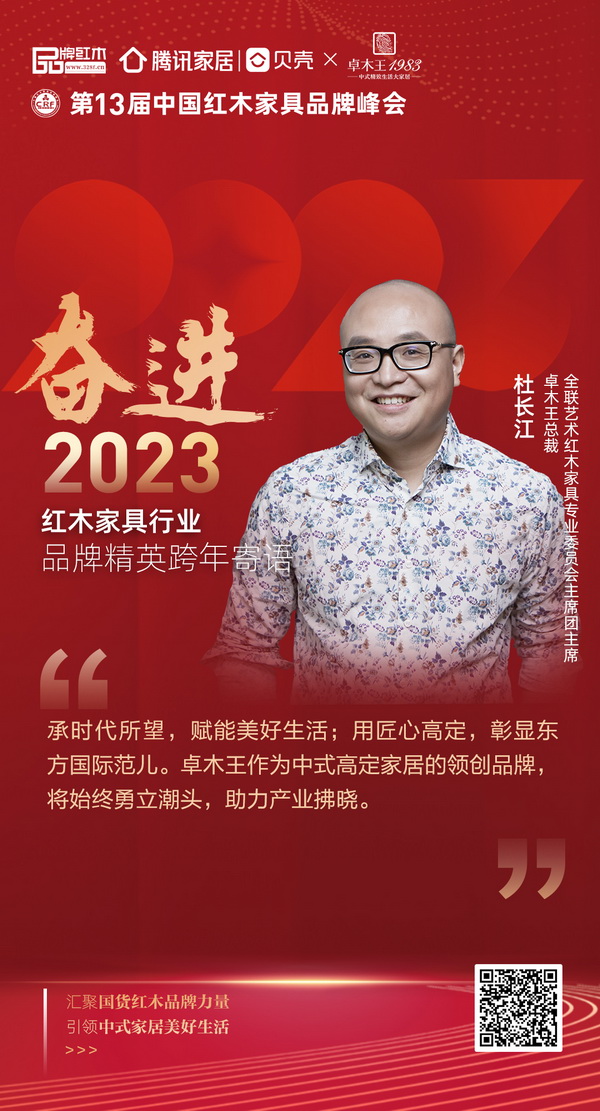 全聯(lián)藝術(shù)紅木家具專業(yè)委員會(huì)主席團(tuán)主席、卓木王總裁杜長(zhǎng)江為紅木家具行業(yè)奮進(jìn)2023年送來(lái)寄語(yǔ):承時(shí)代所望,賦能美好生活;用匠心高定,彰顯東方國(guó)際范兒。卓木王作為中式高定家居的領(lǐng)創(chuàng)品牌,將始終勇立潮頭,助力產(chǎn)業(yè)拂曉。