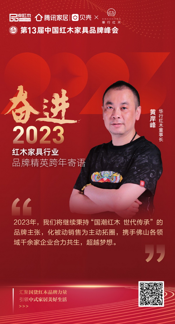 華行紅木董事長黃岸峰為紅木家具行業(yè)奮進2023年送來寄語:2023年,我們將繼續(xù)秉持“國潮紅木 世代傳承”的品牌主張,化被動銷售為主動拓圈,攜手佛山各領(lǐng)域千余家企業(yè)合力共生,超越夢想。