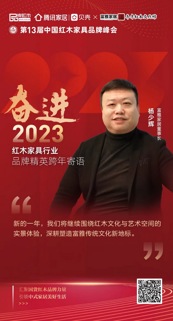富雅家居董事長(zhǎng)楊少輝為紅木家具行業(yè)奮進(jìn)2023年送來(lái)寄語(yǔ):新的一年,我們將繼續(xù)圍繞紅木文化與藝術(shù)空間的實(shí)景體驗(yàn),深耕塑造富雅傳統(tǒng)文化新地標(biāo)。