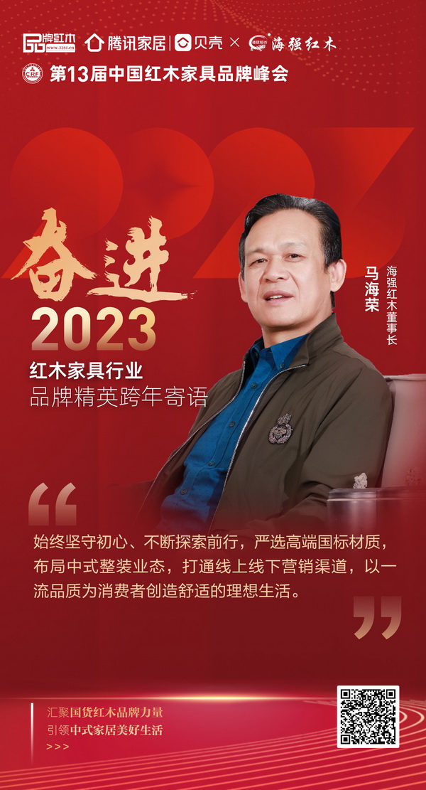 [摘要]海強紅木董事長馬海榮為紅木家具行業(yè)奮進(jìn)2023年送來寄語:始終堅守初心、不斷探索前行,嚴(yán)選高端國標(biāo)材質(zhì),布局中式整裝業(yè)態(tài),打通線上線下營銷渠道,以一流品質(zhì)為消費者創(chuàng)造舒適的理想生活。