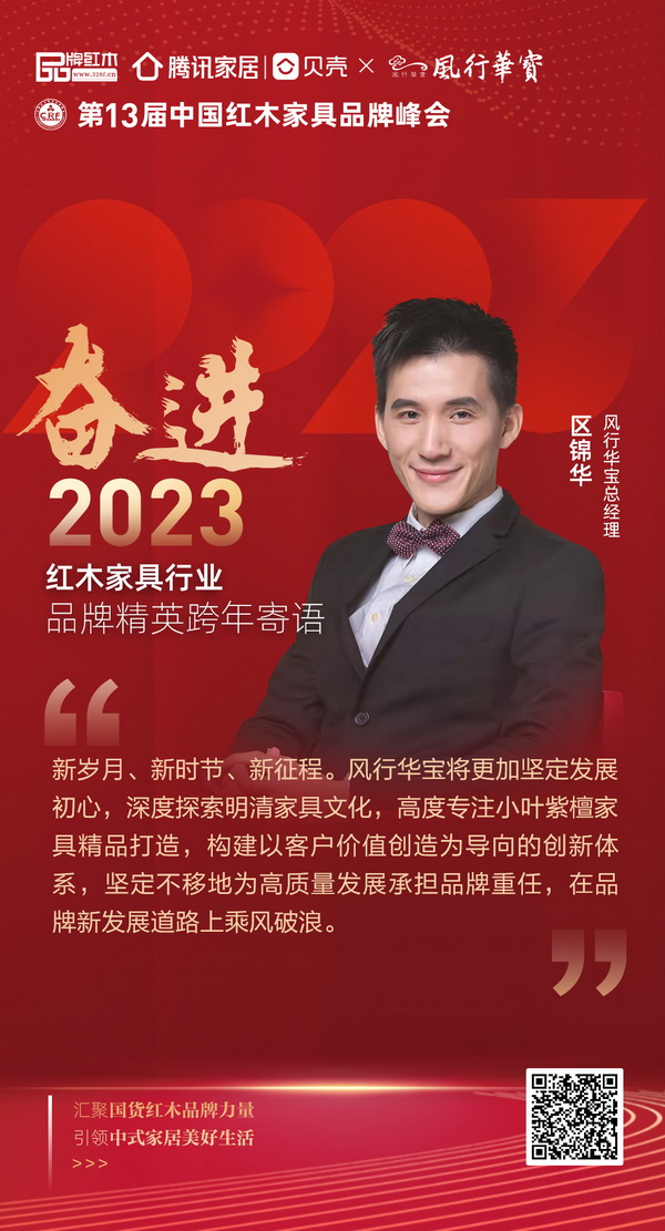 [摘要]?風(fēng)行華寶總經(jīng)理區(qū)錦華為紅木家具行業(yè)奮進(jìn)2023年送來寄語:新歲月、新時(shí)節(jié)、新征程。風(fēng)行華寶將更加堅(jiān)定發(fā)展初心,深度探索明清家具文化,高度專注小葉紫檀家具精品打造,構(gòu)建以客戶價(jià)值創(chuàng)造為導(dǎo)向的創(chuàng)新體系,堅(jiān)定不移地為高質(zhì)量發(fā)展承擔(dān)品牌重任,在品牌新發(fā)展道路上乘風(fēng)破浪。