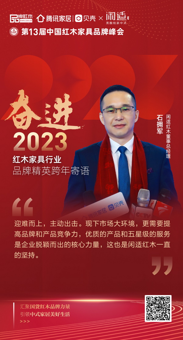 在跨年之際,品牌紅木、騰訊家居|貝殼特別策劃,第13屆中國紅木家具品牌峰會攜手各大業(yè)內(nèi)專家及品牌大咖向廣大業(yè)界人士,發(fā)起“奮進(jìn)2023 紅木家具行業(yè)領(lǐng)袖大咖(品牌精英)跨年寄語”,為全行業(yè)匯聚國貨紅木品牌力量,引領(lǐng)中式家居美好生活!