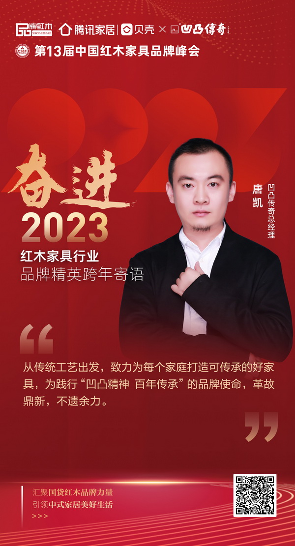[摘要]凹凸傳奇總經(jīng)理唐凱為紅木家具行業(yè)奮進(jìn)2023年送來寄語:從傳統(tǒng)工藝出發(fā),致力為每個(gè)家庭打造可傳承的好家具,為踐行“凹凸精神 百年傳承”的品牌使命,革故鼎新,不遺余力。