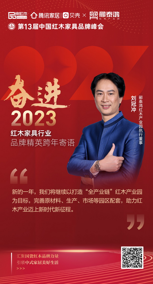 在跨年之際,品牌紅木、騰訊家居|貝殼特別策劃,第13屆中國紅木家具品牌峰會攜手各大業(yè)內(nèi)專家及品牌大咖向廣大業(yè)界人士,發(fā)起“奮進(jìn)2023 紅木家具行業(yè)領(lǐng)袖大咖(品牌精英)跨年寄語”,為全行業(yè)匯聚國貨紅木品牌力量,引領(lǐng)中式家居美好生活!
