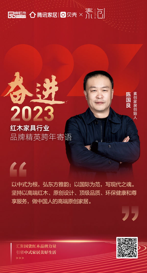 素創(chuàng)家居創(chuàng)始人陳國良為紅木家具行業(yè)奮進(jìn)2023年送來寄語:以中式為根,弘東方雅韻;以國際為范,寫現(xiàn)代之魂。堅(jiān)持以高端紅木、原創(chuàng)設(shè)計(jì)、頂級品質(zhì)、環(huán)保健康和尊享服務(wù),做中國人的高端原創(chuàng)家居。