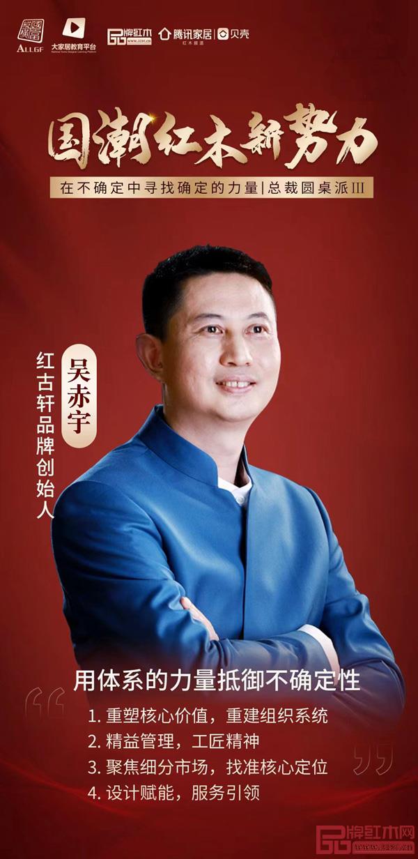 5月20日,由品牌紅木、騰訊家居|貝殼、國富縱橫聯(lián)合主辦的“國潮紅木新勢力 總裁圓桌派Ⅲ——在不確定中尋找確定的力量”大型直播活動圓滿舉行。紅古軒品牌創(chuàng)始人吳赤宇作為圓桌派參會嘉賓,以《用體系的力量抵御不確定性》為主題做了精彩分享,為行業(yè)提供可借鑒的成功經(jīng)驗與有效方法,共同在不確定中弘揚中國紅木的力量。