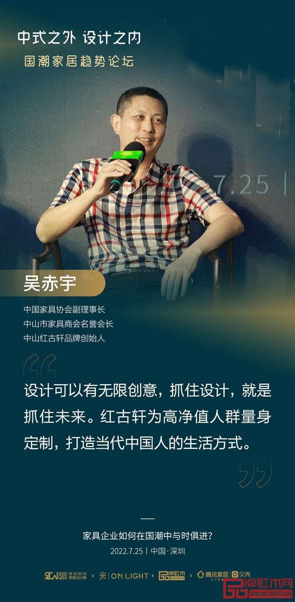7月25日,主題為“中式之外·設(shè)計之內(nèi)”的國潮家居趨勢論壇在深圳國際會展中心舉行。紅古軒品牌創(chuàng)始人吳赤宇受邀出席論壇,并就“家具企業(yè)如何在國潮中與時俱進”話題在論壇上發(fā)表觀點。他認為,家具企業(yè)要在國潮中與時俱進,設(shè)計可以無限創(chuàng)意,抓住設(shè)計就是抓住未來!