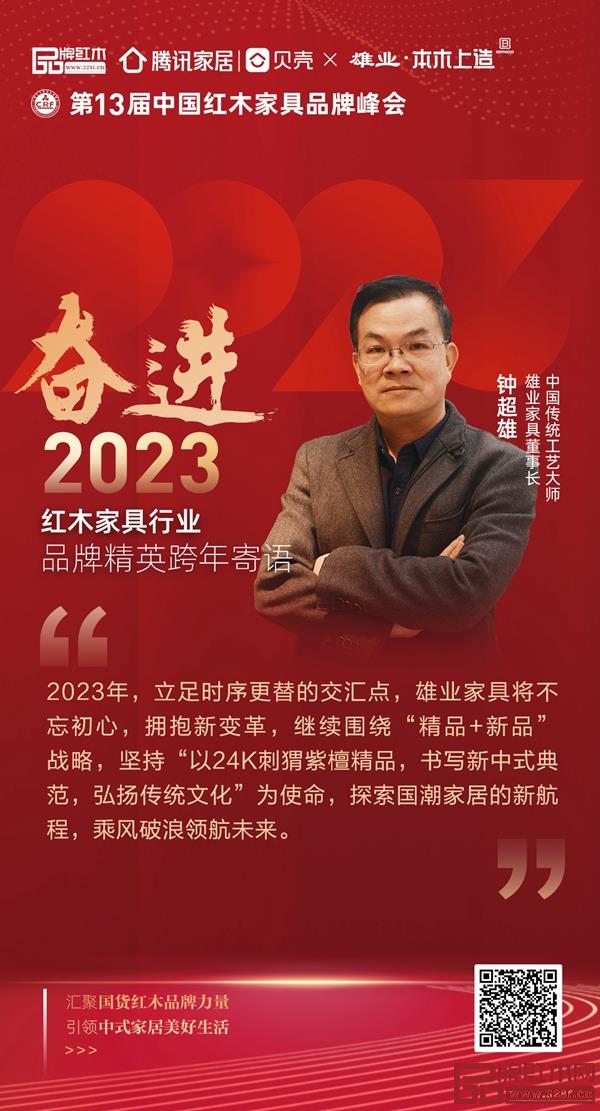 12月26日,在跨年之際,雄業(yè)家具董事長(zhǎng)鐘超雄為雄業(yè)家具作品牌跨年發(fā)聲,弘揚(yáng)國(guó)貨紅木品牌力量,引領(lǐng)中式家居美好生活。