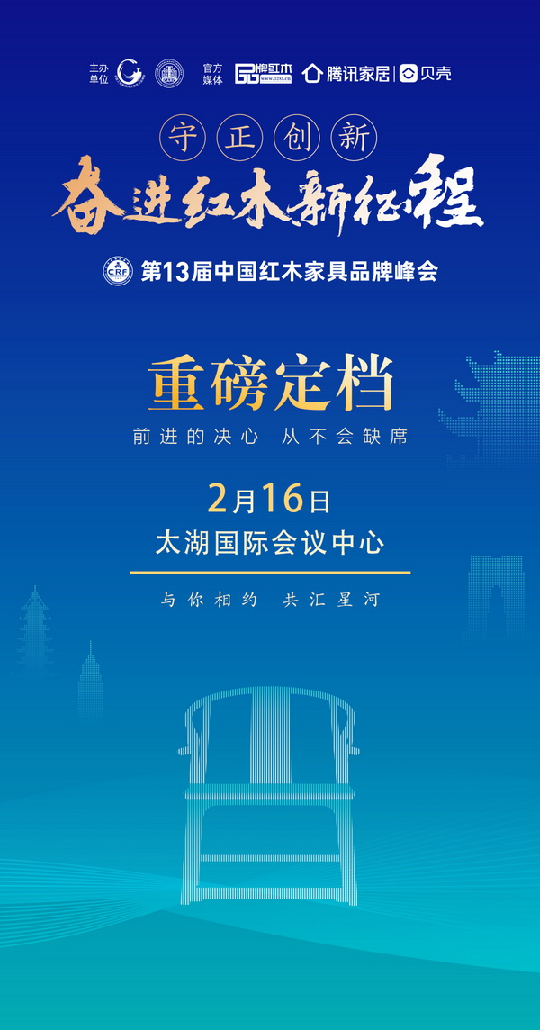 讓我們相約2月16日,相約太湖國際會議中心,相約第13屆紅木品牌峰會,一起守正創(chuàng)新,奮進新征程,共同書寫紅木行業(yè)復(fù)蘇路上的光榮與夢想。
