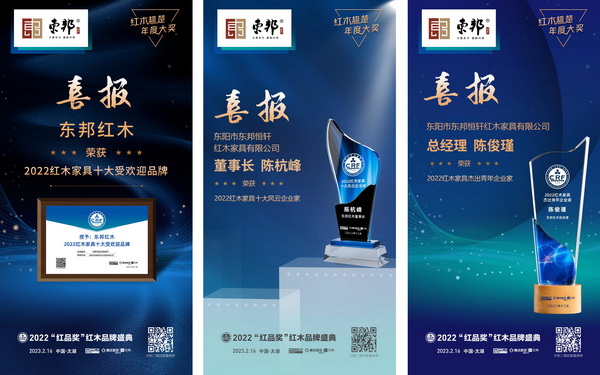 2月16日,第13屆中國紅木家具品牌峰會如期而至。本次大會在風(fēng)景如畫的蘇州太湖國際會議中心圓滿舉行!作為盤點行業(yè)年度優(yōu)秀品牌和個人的“紅品獎”紅木品牌頒獎典禮也同期隆重舉行。東邦紅木成功榮獲“2022紅木家具十大受歡迎品牌”,董事長陳杭峰憑借32年的行業(yè)積淀,被授予“2022紅木家具十大風(fēng)云企業(yè)家”,總經(jīng)理陳俊瑾蟬聯(lián)“2022紅木家具杰出青年企業(yè)家”榮譽,榮獲三項大獎,展現(xiàn)了東邦紅木的品牌實力。