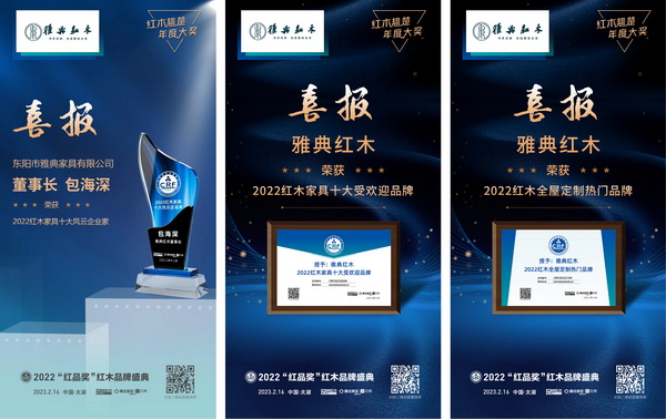 2月16日,第13屆中國(guó)紅木家具品牌峰會(huì)在蘇州太湖國(guó)際會(huì)議中心隆重舉行。2022 CRF“紅品獎(jiǎng)”頒獎(jiǎng)典禮也同步舉行,雅典紅木榮獲“2022紅木家具十大受歡迎品牌”和“2022紅木全屋定制熱門品牌”雙料大獎(jiǎng),董事長(zhǎng)包海深榮獲“2022紅木家具十大風(fēng)云企業(yè)家”,展現(xiàn)了品牌的實(shí)力。