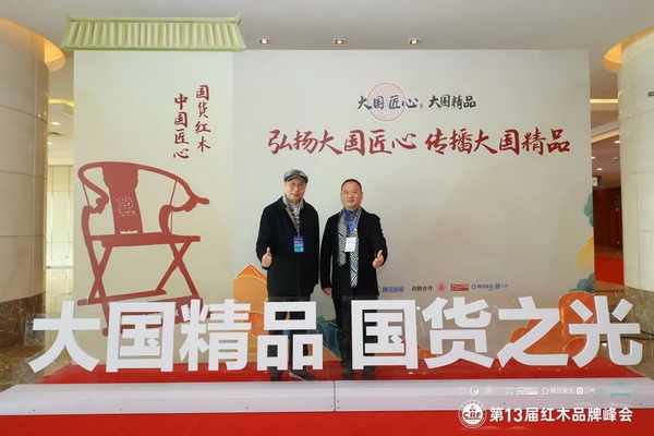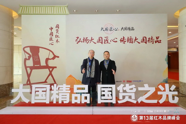 雅典紅木董事長(zhǎng)包海深(右)和總經(jīng)理包相城(左)受邀出席第13屆中國(guó)紅木家具品牌峰會(huì)