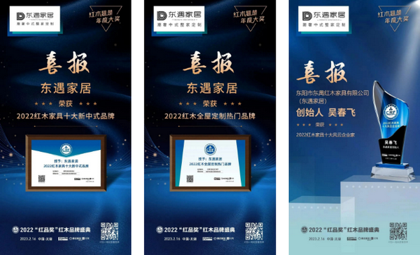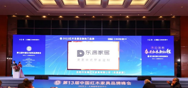 東陽市東禺紅木家具有限公司(以下簡稱“東遇家居”)受邀出席本次盛會,同時,東遇家居連奪三獎,榮獲“2022紅木家具十大新中式品牌”、“2022紅木全屋定制熱門品牌”,品牌創(chuàng)始人吳春飛榮膺“2022紅木家具十大風(fēng)云企業(yè)家”,構(gòu)筑企業(yè)發(fā)展新高度。