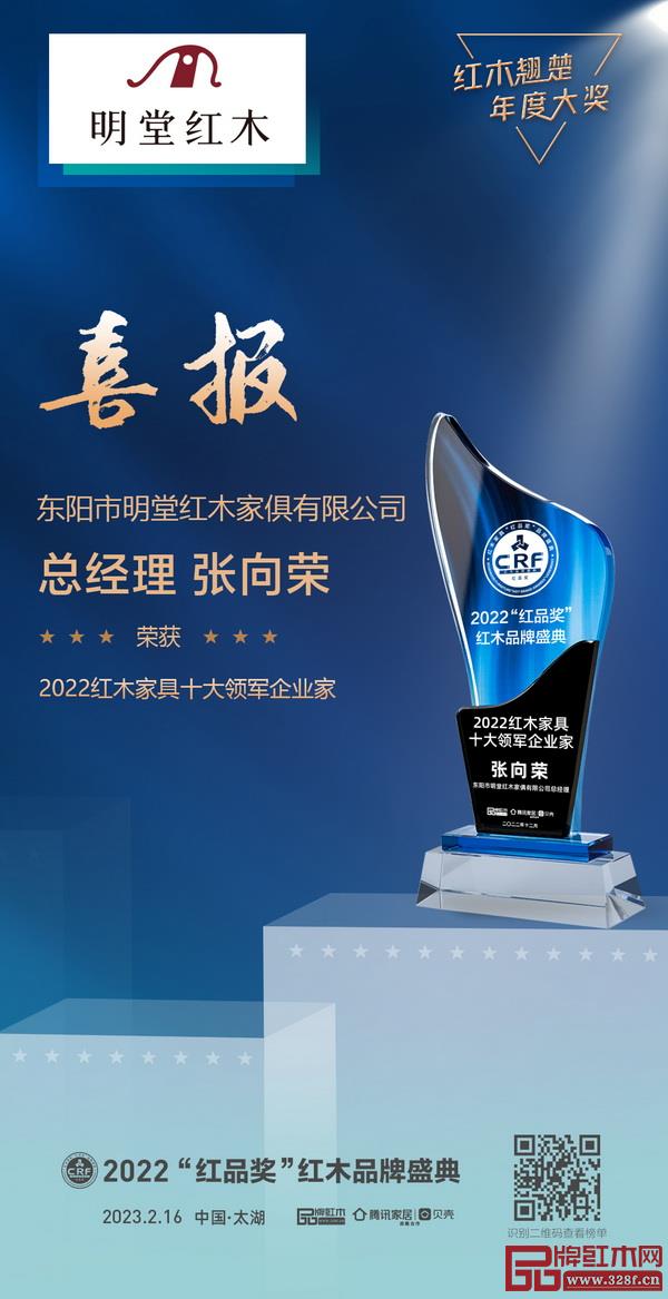 同時(shí),明堂紅木總經(jīng)理張向榮斬獲“2022紅木家具十大領(lǐng)軍企業(yè)家”的榮譽(yù)稱號(hào),以表彰其對(duì)行業(yè)的卓越建樹(shù)。