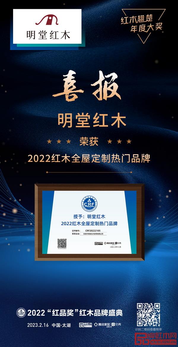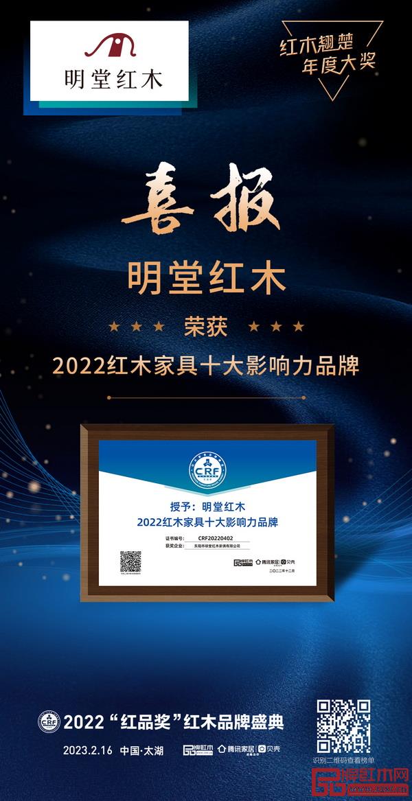 明堂紅木榮獲“2022微凹黃檀家具熱門(mén)品牌”